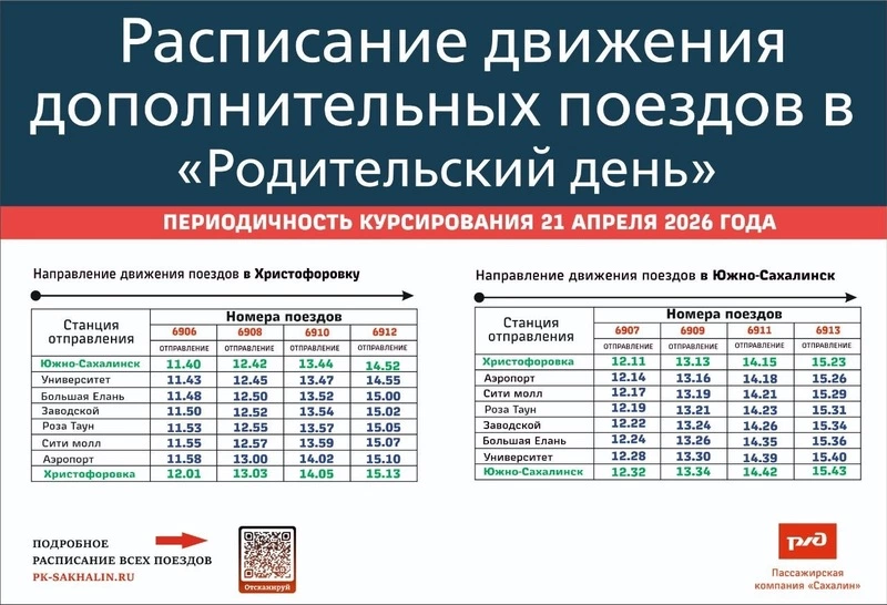 Во вторник, 21 апреля, дополнительные пригородные поезда будут курсировать по маршруту Южно-Сахалинск — Христофоровка и обратно, чтобы жители города могли добраться до кладбищенского комплекса № 3. Об этом сообщили в пресс-службе АО «ПК „Сахалин“».