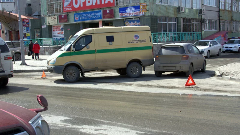 15 апреля, примерно в 12:00 инкассаторы «Тихоокеанского Внешторгбанка» отъезжали от места работы. Сдавая назад, водитель не заметил заворачивающую во двор «Тойоту Витц» и помял последней заднее крыло.
