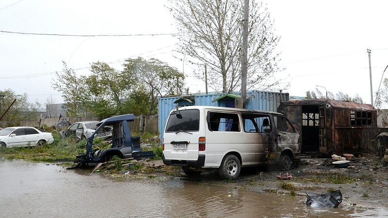 Едем на место. По дороге, конечно, фотографируем упавшие деревья. Много. Очень много. И вдоль дороги, и шлагбаумом через дорогу, и на машинах… Приезжаем в автомастерскую на Холмском шоссе. Ту самую, которые охраняют «трансформеры». Тут же к съемочной группе кидаются китайские мастеровые. Не спрашивая, кто мы, нерусский мужчина с русским именем Игорь начинает рассказывать:
