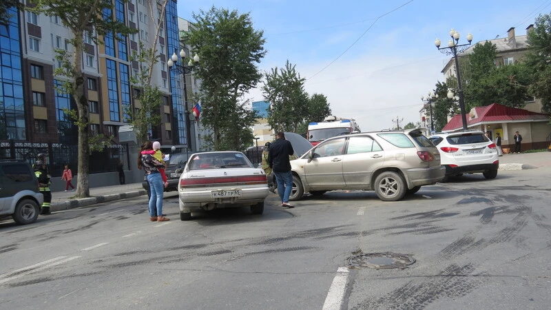 В центре Южно-Сахалинска 27 июля произошла серьезная авария. Дорогу не поделили кроссовер и легковушка. По предварительным данным, в салоне одной из машин находился маленький ребенок.