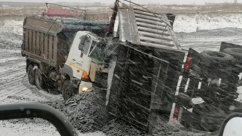 По предварительным данным, при разгрузке водитель самосвала ООО «Сервис-Интегратор Сахалин» начал движение и заехал на гору угля с поднятым кузовом. Автомобиль накренило в левую сторону, после чего большегруз резко завалился на стоящий поблизости грузовой автомобиль.