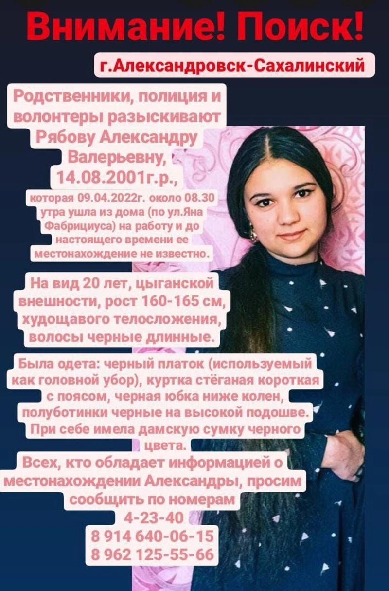 Объявление о пропаже человека опубликовал Telegram-канал «ЧП Сахалин». Девушку ищут родственники, полиция и волонтеры. В 8:30 утра 9 апреля она ушла из дома на работу и пропала.