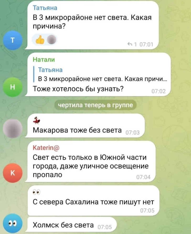 «Уважаемые жители! По информации ФРС ПАО „Сахалинэнерго“ произошло аварийное отключение всего района, причины выясняются. Номер телефона дежурного ЕДДС: 8(42434)4-44-02», — оповещают население.