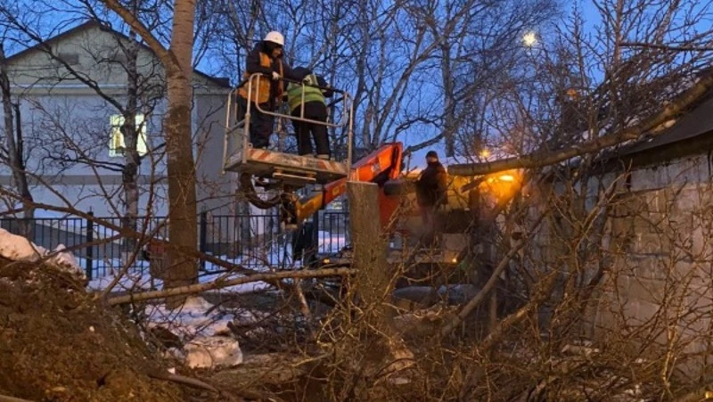 Как сообщили в Telegram-канале администрации Южно-Сахалинска, устранение порыва на улице Тихоокеанской, 28 пока затруднено — подобраться к сетям мешает старый тополь. Дерево уже убирают, после чего специалисты приступят к ликвидации повреждения.