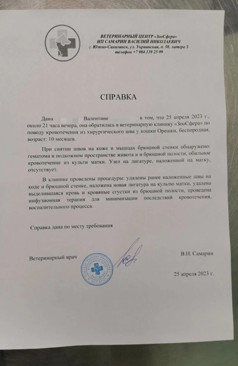«Я прочитал на 2Gis письмо этой хозяйки, даже не стал отвечать, потому что она утверждает, что начал кровить шов и она обратилась в какую-то другую ветеринарную лечебницу, а там было какое-то внутреннее кровотечение. К сожалению, в Южно-Сахалинске этики среди ветеринарных врачей очень мало. Я знаю, куда она обратилась, потому что мы все друг друга знаем. Нужно понимать, что ветеринария — это маркетинг, и для того, чтобы заработать денег, кошке делали какую-то операцию. Любой разумный человек должен понимать, что при внутреннем кровотечении наружный шов кровить не будет и кошка умрет через три часа», — прокомментировал ветеринар.