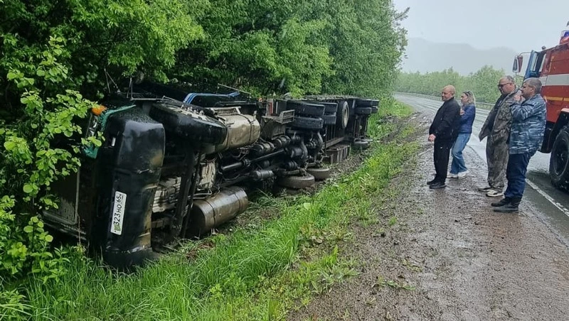 Прибыв на место, пожарные в первую очередь приняли меры для предотвращения возможных вторичных последствий аварии. Они отключили аккумуляторную батарею у опрокинувшегося грузовика, чтобы исключить риск короткого замыкания и последующего возгорания.