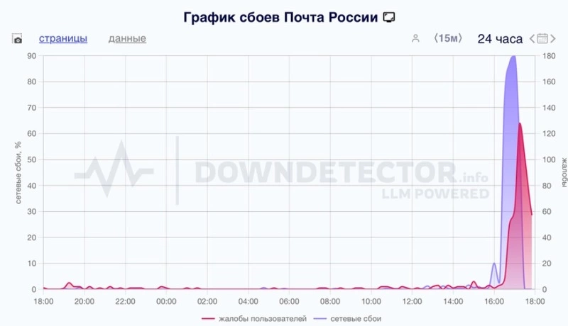 Пик жалоб зарегистрирован 29 июля в 17:00 мск (01:00 на Сахалине, 30 июля). Россияне сообщают о сбое в работе сервисов, сайта и мобильного приложения «Почты России».