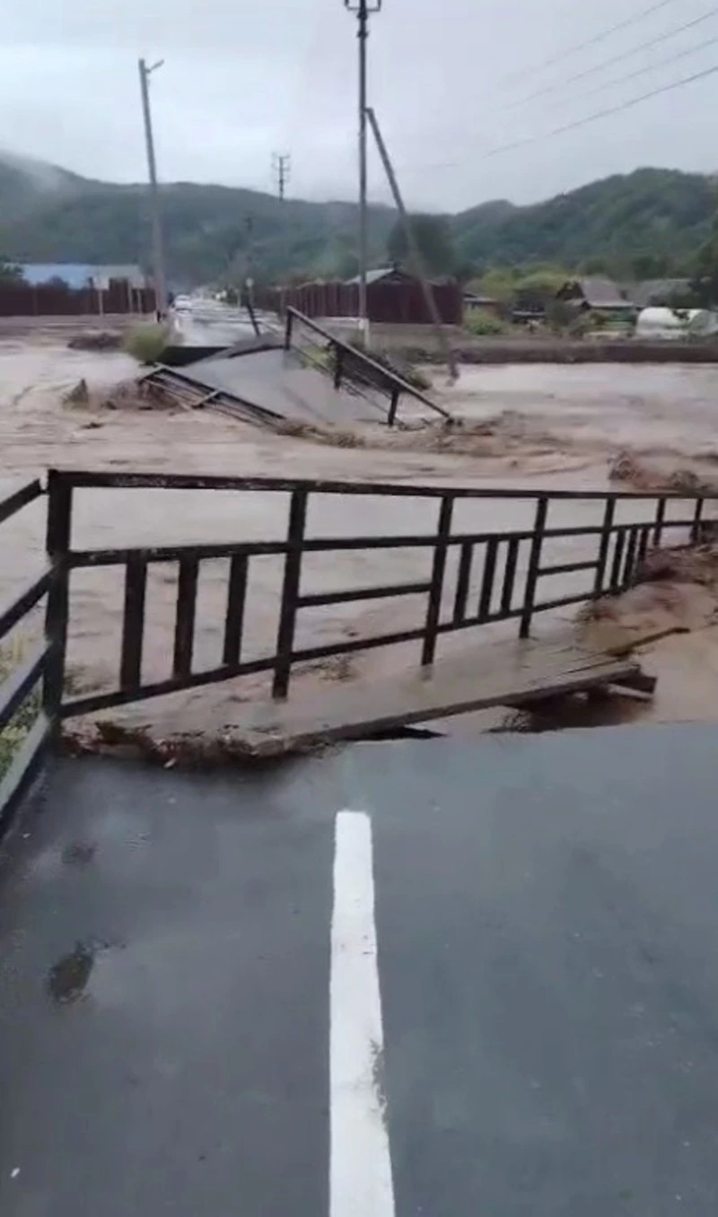 На фото и видео видно, как бурный поток воды снес мостовую переправу. Дорожное полотно провалилось и ушло под воду, оставив жителей отрезанными от сообщения.