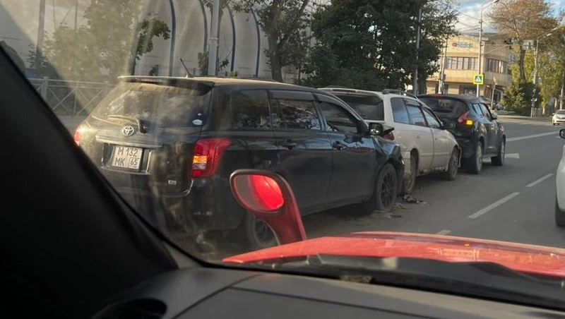 Днем 10 октября в Южно-Сахалинске на улице Железнодорожной произошло ДТП с участием нескольких автомобилей. Как сообщают очевидцы Sakh.online, машины столкнулись по принципу «паровозика», собравшись в одну цепочку.
