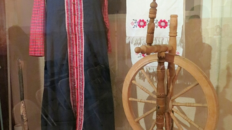 Представлены и современные плюшевые животные. Все это, как и деревянные ложки, берестяные кузовки, вышневолочковская прялка, уже видели посетители Музея медведя. А вот архангельский костюм 19 века – льняная рубаха и сарафан ручной работы – эксклюзивный экспонат, ранее не выставлялся. Он был куплен в антикварном магазинчике в городе Каргополь.