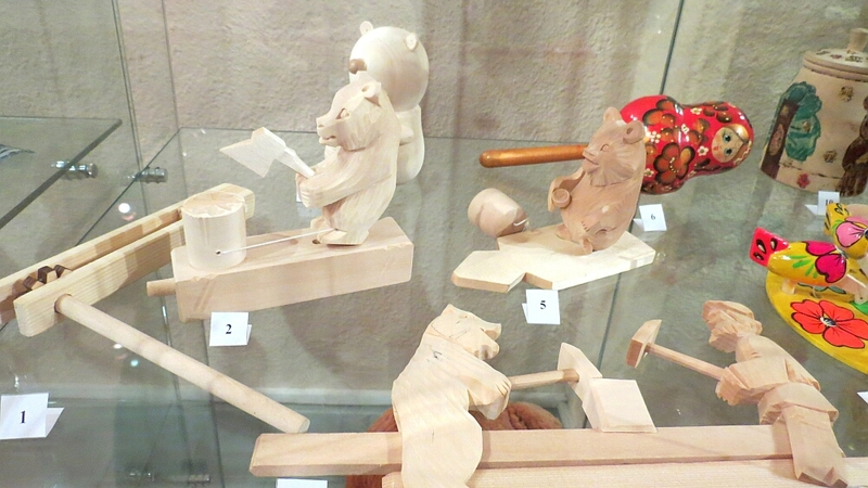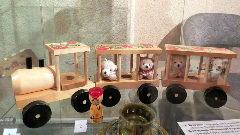 Самая простая фигурка медведя на выставке – пластмассовая игрушка 1970 года, самая древняя – дореволюционная игрушка из прессованных опилок. Напоминает она больше статуэтку, но именно такими первоначально были игрушки. Есть здесь заводной плюшевый медведь, набитый опилками, какие выпускали отечественные заводы в 1950-90 годах, деревянная статуэтка 2000 года из Японии, прототип медведя Тедди, мишки фарфоровые, деревянные.