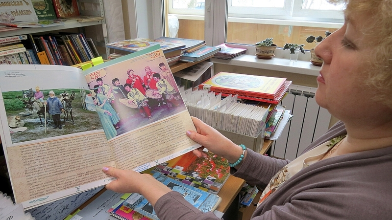 Первым делом ребят познакомили с условиями быта народов Севера, их национальными костюмами, предметами охоты, музыкальными инструментами. Пособием для этого послужила книга из фондов детской библиотеки «Культурное наследие народов Дальнего Востока. Сахалинская область». Например, школьники узнали, что из бересты нивхи плетут туески, в которых носят ягоды и воду, а также берестой украшают национальные костюмы.