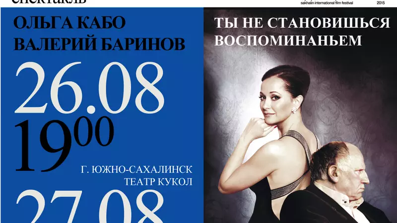 О любви поведают сахалинцам заслуженная артистка России О. Кабо и народный артист России В. Баринов. Именно этому всепоглощающему чувству посвящен созданный в 2014 году удивительный спектакль «Ты не становишься воспоминаньем…», в котором соединились музыка и любовная лирика, прозаические отрывки и театрализованное действо.
