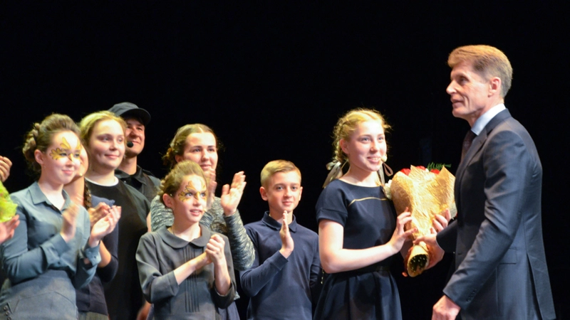 Он от имени переживших войну ребенком вручил цветы и благодарственные письма Мстиславу Пентковскому, Тиграну Ахназаряну и хормейстеру сахалинской постановки Валентине Тутуровой. А вот губернатор Олег Кожемяко и мэр Сергей Надсадин свои букеты вручили юным исполнителям Александру Румянцеву и Полине Гринь.