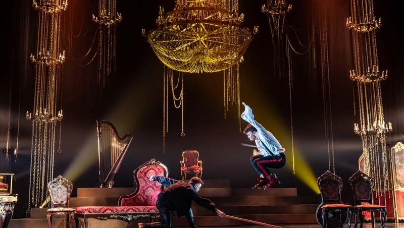 Театр не экономил на декорациях: к потолку прикреплены четырехэтажные люстры с массивными цепями, на сцене – резная мебель, серебряная посуда, музыкальные инструменты — пианино с арфой, а конфетти высыпали столько, что можно было купаться в блестках. Этим и занимался один из главных героев.