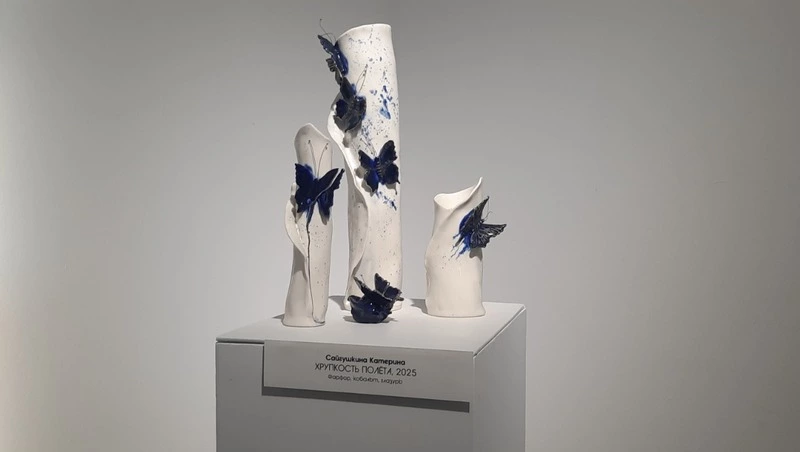 Весомую часть выставки составляют работы мастерицы Екатерины Сайгушкиной — вазы, декоративные тарелки. Также можно встретить очаровательных сивучей, фигуру ангела и объемные Быковские пороги, помещенные в металлическую конструкцию. Творения Екатерины легкие, воздушные, будто дышащие, как живые существа.