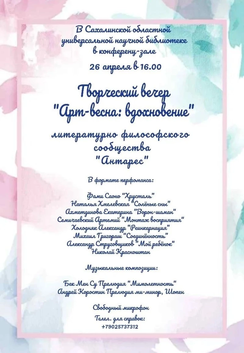 Мероприятие начнется в 16:00, вход на него свободный. Организатором перформанса «Арт-весна: вдохновение» выступило литературно-философское сообщество «Антарес».