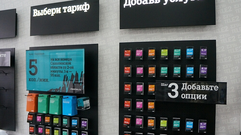 Сначала клиент подходит к специальной панели с номерами и выбирает понравившуюся комбинацию цифр. Затем посетитель супермаркета определяется с тарифом и дополняет его необходимыми услугами. Здесь же можно приобрести телефон и аксессуары. Для корпоративных клиентов открыта секция с готовыми решениями, разработанными под конкретные задачи малого и среднего бизнеса. Наполнив корзину продуктами, покупатель оплачивает свои покупки на кассе и может сразу же начать пользоваться услугами сети Tele2.