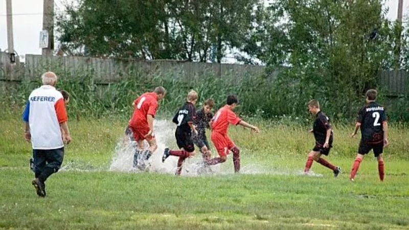 Между тем футбольное поле на городском стадионе Поронайска еще не «оправилось» после недавних проливных дождей. Игроки с трудом выбирались из вязкой жижи, мяч тонул глубоких лужах, точные пасы были редким исключением.