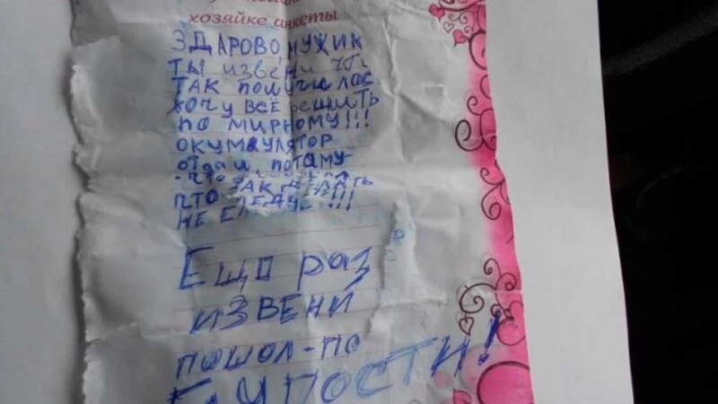«Здарово, мужик. Ты извени что так получи лос. Хочу все решить по мирному!!! Окумулятор отдал, потаму-что осознал что так делать не следует. Ещо раз извени пошол-по глупости!» (орфография сохранена).
