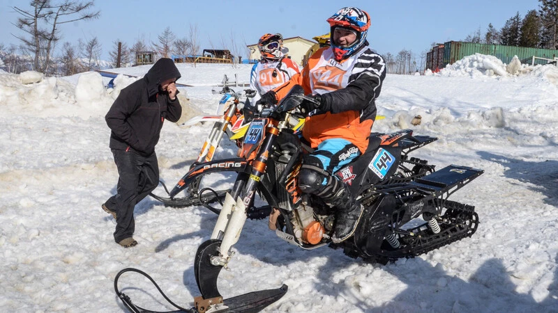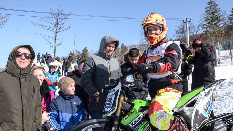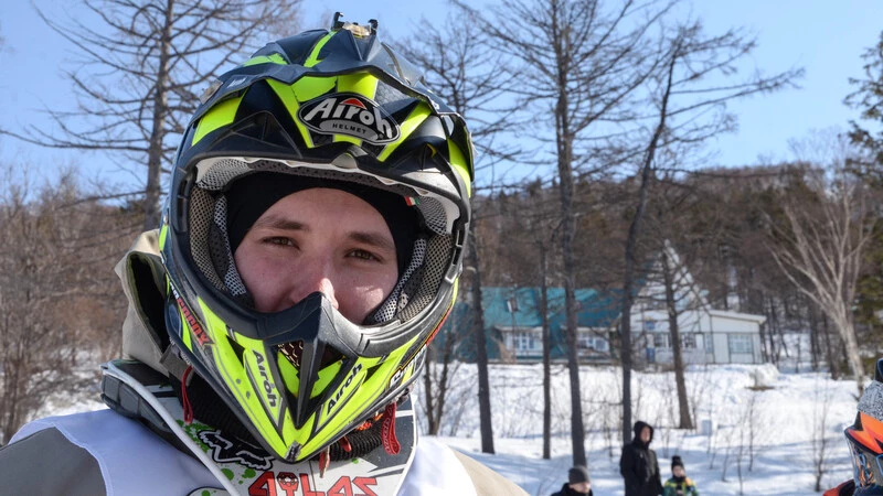 Южносахалинец Артем Юрчук выступал за долинский клуб «Мотор». После тренировочного заезда не выдержала нагрузки при приземлении после прыжка цепь и лопнула. В порядок ее приводили, как говорят, всем миром. Помогли инструментами и советом. Процесс напомнил снежный пит-стоп.