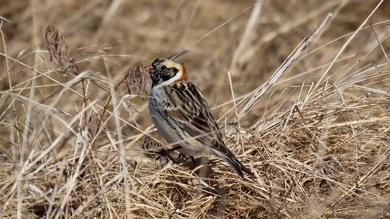 Очень похожий на воробья, но имеющий явные отличия от воробьиных лапландский подорожник тоже прилетел на остров. Весной самцы данного вида принимают характерную яркую окраску: черная маска на передней части головы, спускающаяся в виде передничка на грудь, отчетливая рыжевато-белая «бровь» и яркая «ржавчина» на зашейке. У самочек оперение схоже, но немного бледнее. На Курилах эти птицы надолго не задержатся, так как их главный путь лежит к местам гнездования в Восточной Сибири.
