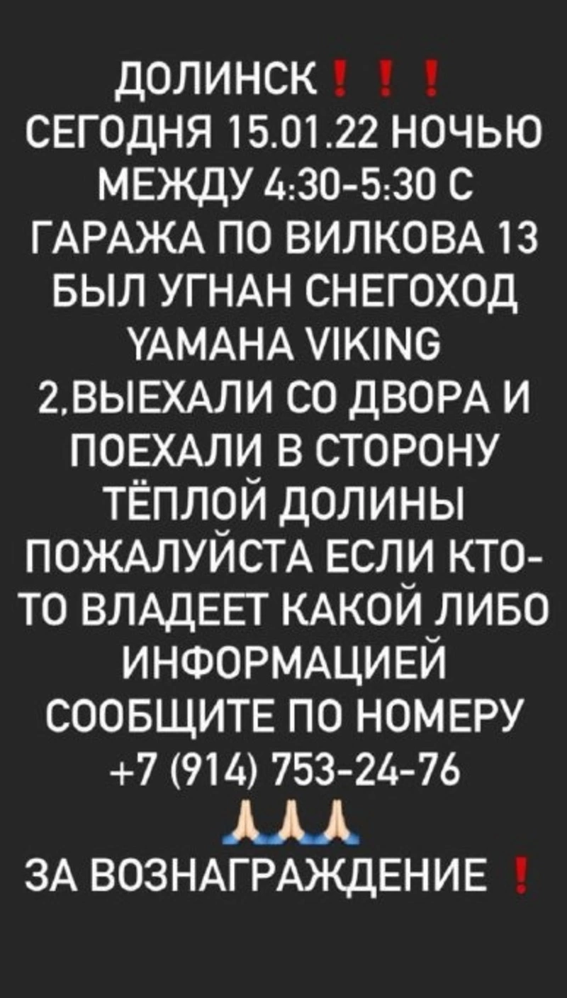 «Долинск. 15 января ночью, между 04:30 и 05:30, с гаража по Вилкова, 13 был угнан снегоход Yamaha Viking 2. Выехали со двора и поехали в сторону Теплой долины», — сообщил автор.