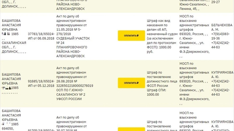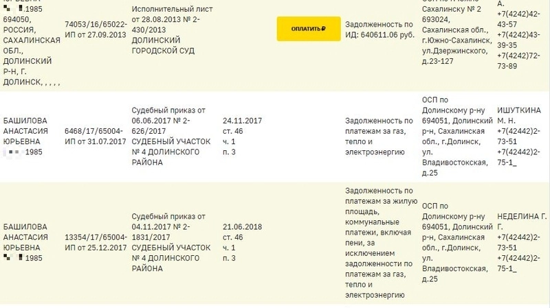 Как следует из официальных данных базы УФССП по Сахалинской области, Башилова задолжала 640 611,06 рубля по алиментным платежам. Кроме того, за женщиной числятся три неоплаченных административных штрафа по 1000 рублей каждый. Наказания она получила за нарушения, совершенные в Южно-Сахалинске. За неоплату Башилову приговорили к обязательным работам.