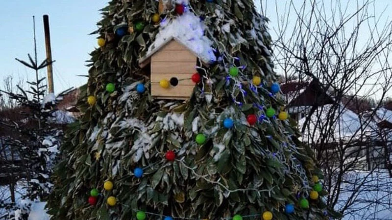 Для бамбуковой елки даже не потребовалось много украшений, оказалось достаточно лишь разноцветной гирлянды, небольшого скворечника и снега, который сам по себе эффектно лег на листья.