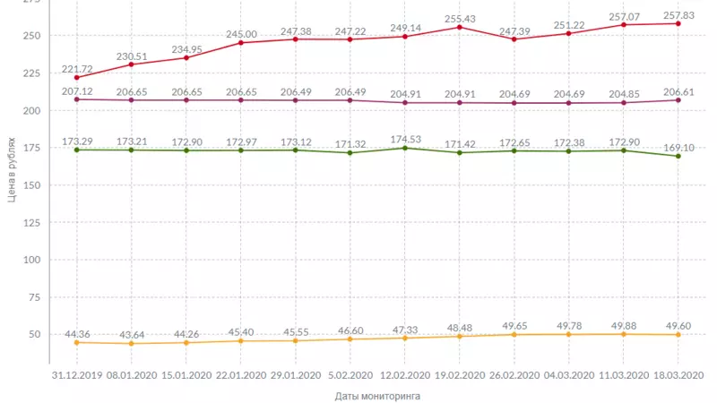 В ассортименте мясных товаров осталась стабильной стоимость свинины (343,9 рубля) и мороженой рыбы (115 рублей и 1 копейка). Говядина выросла в цене на 1 рубль и 23 копейки, а курица подешевела на 2 рубля и 17 копеек.
