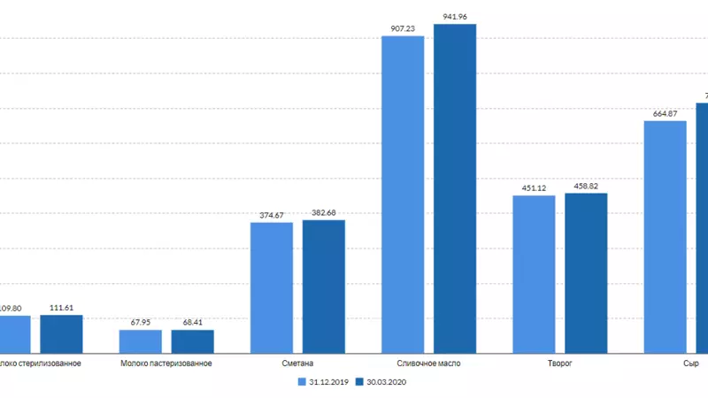 На молочном рынке по итогам трехмесячной динамики понижения цен нет. Заметнее всего подорожали сливочное масло (на 34,73 рубля) и сыр (на 51,62 рубля). Творог вырос в цене на 7 рублей и 70 копеек, а сметана — на 8 рублей и 1 копейку. Литр пастеризованного молока с января по март прибавил 46 копеек, а стерилизованное подорожало на 1 рубль и 81 копейку.