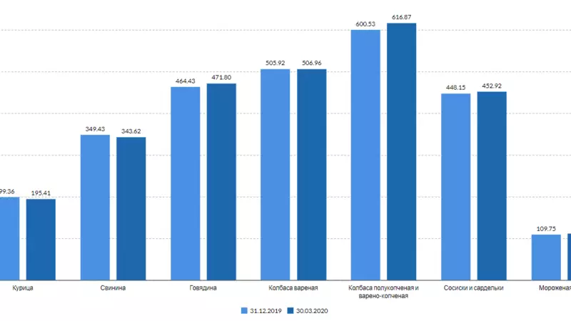 В ассортименте мясных товаров (в том числе полуфабрикатов) вареная колбаса выросла в цене на 1 рубль и 4 копейки. Полукопченые и варено-копченые деликатесы подорожали на 16 рублей и 34 копейки за три месяца. Сосиски и сардельки за это же время прибавили в цене 4 рубля и 77 копеек, а мороженая рыба — 2 рубля 86 копеек. Говяжье мясо подорожало на 7 рублей и 37 копеек. Подешевели только свинина и мясо курицы — на 5,81 и 3,95 рубля соответственно.