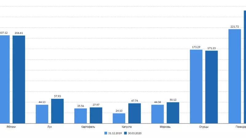 Что касается овощей и фруктов, по итогам первого квартала текущего года немного подешевели яблоки — на 51 копейку. Немного упала и стоимость огурцов: за килограмм теперь просят на 2 рубля и 6 копеек меньше, чем в последний день 2019 года. А вот помидоры подорожали на 43 рубля и 72 копейки. На 13 рублей и 80 копеек больше, чем три месяца назад, попросят за килограмм репчатого лука. Картофель вырос в цене на 2 рубля и 41 копейку, а капуста подорожала почти вдвое — на 23 рубля и 64 копейки. Цена за килограмм моркови увеличилась на 5 рублей и 77 копеек.