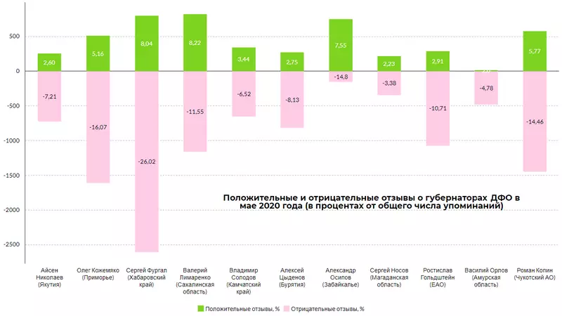 Кроме упоминаний о губернаторах в социальных сетях, эксперты ЦПК проанализировали характер оценок их деятельности. В процентном соотношении глава Сахалинской области занял 5-е место в ДФО по объему негативных сообщений в свой адрес и первое — по числу положительных отзывов (11,55 и 8,22 процента соответственно).