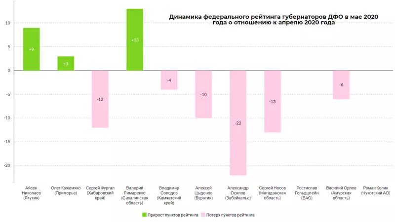 Среди дальневосточных губернаторов Валерий Лимаренко прочнее остальных укрепил свою позицию медиарейтинга. Рост на 13 пунктов позволил главе Сахалинской области стать первым по этому показателю за месяц в ДФО. На втором месте якутский губернатор Айсен Николаев (+9 пунктов), на третьем — приморский руководитель Олег Кожемяко (+3 пункта), а четвертую строчку разделили Ростислав Гольдштейн (ЕАО) и Роман Копин (Чукотский АО), позиции которых не изменились. У остальных политиков Дальнего Востока рейтинги упали. Антирекорд поставил губернатор Забайкалья Александр Осипов, который провалился сразу на 22 пункта. Он же стал первым по этому отрицательному показателю в России.