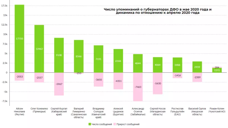 Практически все дальневосточные губернаторы, за исключением главы Чукотки, в мае становились объектами обсуждения интернет-пользователей реже, чем в апреле. Число сообщений, в которых так или иначе упоминали политиков, снизилось у 10 руководителей регионов. Только про губернатора Чукотского АО в последний месяц весны написали на 284 сообщения больше. Все остальные главы регионов ушли в минус по этому показателю. При этом у Валерия Лимаренко «убыток» составил меньше, чем у коллег — всего на 253 сообщения меньше в социальных сетях. Лидером по понесенным потерям оказался Александр Осипов (Забайкальский край), который лишился 7 463 упоминаний в сравнении с апрельским рейтингом.