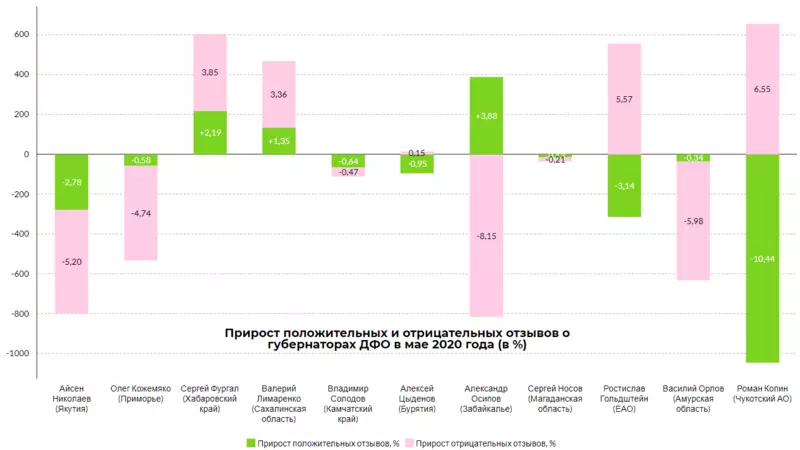 В долевом соотношении глава островного региона занимает четвертое место в ДФО по приросту критических упоминаний и третье — по прибавке к репликам с похвалой и поддержкой.