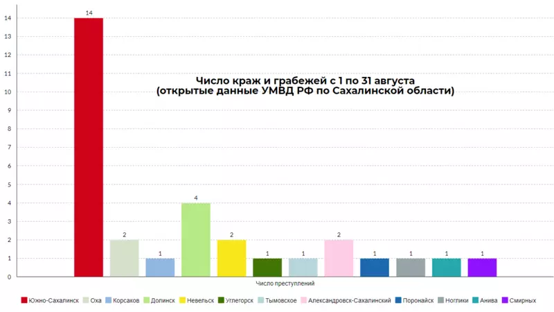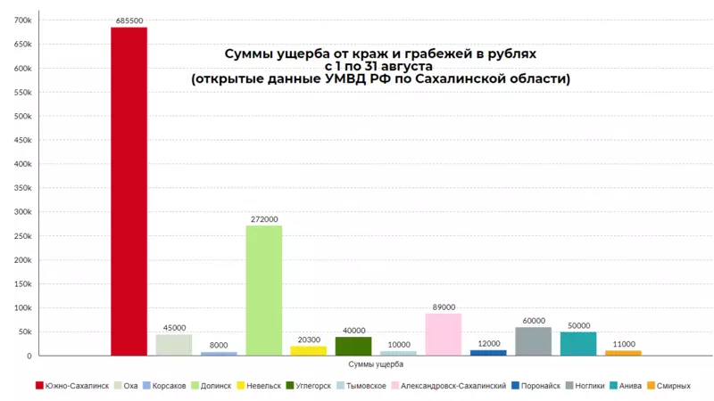 На втором месте по суммам краж и грабежей оказался Долинский район. Там преступники поживились на 272 тысячи рублей. В Александровск-Сахалинском городском округе злоумышленники присвоили чужое имущество на сумму около 89 тысяч рублей, а в Ногликах заработали таким образом 60 тысяч. Еще 50 тысяч рублей им удалось раздобыть в Анивском районе, на 45 тысяч воры и грабители разжились в Охинском городском округе, на 40 — в Углегорске. Неудачными в августе стали Невельский район (20 300 рублей), Поронайск (12 тысяч рублей), Смирных (11 тысяч) и Тымовское (10 тысяч). Но самым «бедным» с этой точки зрения выглядит Корсаков: там нарушителям закона удалось добыть только 8 тысяч.