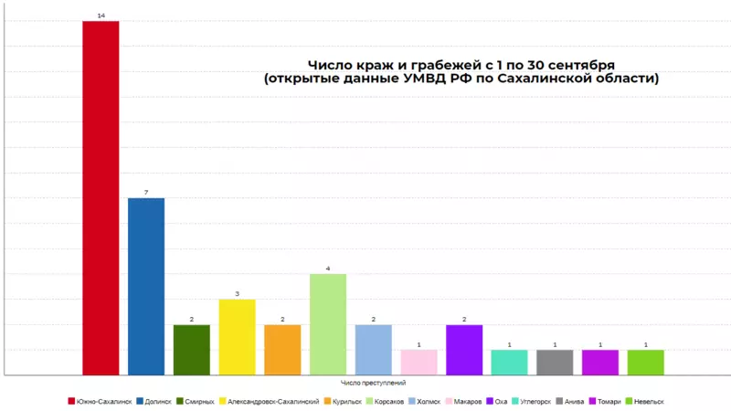 По числу краж и грабежей областной центр также лидирует. С 1 по 30 сентября там случилось 14 преступлений такого рода. В Долинском районе зарегистрировано семь хищений, в Корсаковском — четыре, в Александровск-Сахалинском — три. В Охинском, Холмском, Смирныховском и Курильском муниципалитетах злоумышленники выходили на дело по два раза. В Томаринском, Макаровском, Анивском, Углегорском и Невельском районах зафиксировали по одному факту злодеяний.