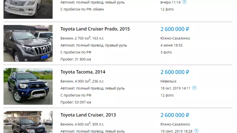 Так, злоумышленники могут раскошелиться на Toyota Land Cruiser 2013 года выпуска с левым рулем и 309 лошадиными силами. Его «родственник» 2015 года выпуска с правым рулем и менее объемным двигателем обойдется в такую же сумму. За 2,6 миллиона преступники могут выбрать Toyota Tacoma 2014 года или же Lexus LX570 — внедорожник 2011 года с левым рулем предлагают не только к продаже, но и к обмену.