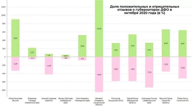 Однако, если переводить процентную долю сообщений той или иной направленности в количественный показатель, картина немного меняется. Так, по числу позитивных публикаций в социальных сетях Валерий Лимаренко стал третьим на Дальнем Востоке — его хвалили в октябре 687 раз. Губернатор Сахалинской области уступил коллегам из Якутии и Камчатского края, про которых говорили хорошо 831 и 823 раза соответственно. Главный аутсайдер списка Михаил Дегтярев по этому показателю вышел на четвертое место: о нем позитивно отзывались 603 раза за месяц.