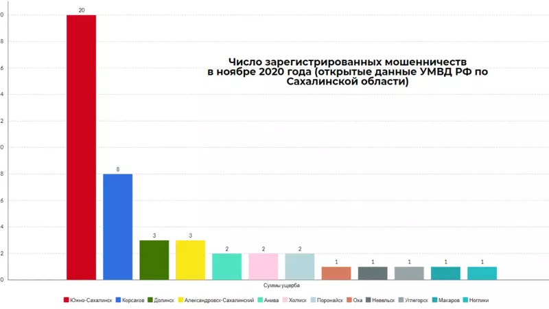 Что касается количества зарегистрированных преступлений, по этому показателю Южно-Сахалинск лидирует с большим отрывом. С 1 по 30 ноября, по открытым данным областного УМВД, там зарегистрировали 20 эпизодов мошенничества. Корсаковский городской округ оказался на втором месте: там за месяц аферисты промышляли восемь раз. Долинск и Александровск-Сахалинский привлекли злоумышленников трижды. В Анивском, Холмском и Поронайском районах зарегистрировано по два факта имущественных преступлений, а в Охе, Невельске, Углегорске, Макарове и Ногликах — по одному.