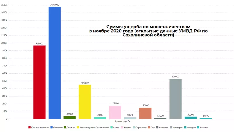 На четвертом месте по этому показателю неожиданно оказался Александровск-Сахалинский район, где преступники добыли 450 800 рублей. В Холмском городском округе они поживились на 177 тысяч рублей, в Охинском — на 150 тысяч, в Долинском — на 38 500 рублей. В Макаровском городском округе мошенники выманили у населения 30 тысяч рублей, в Анивском — 25 тысяч, в Поронайском — 23,5 тысячи, в Ногликском — 14 600 рублей, в Невельском — 14 тысяч.