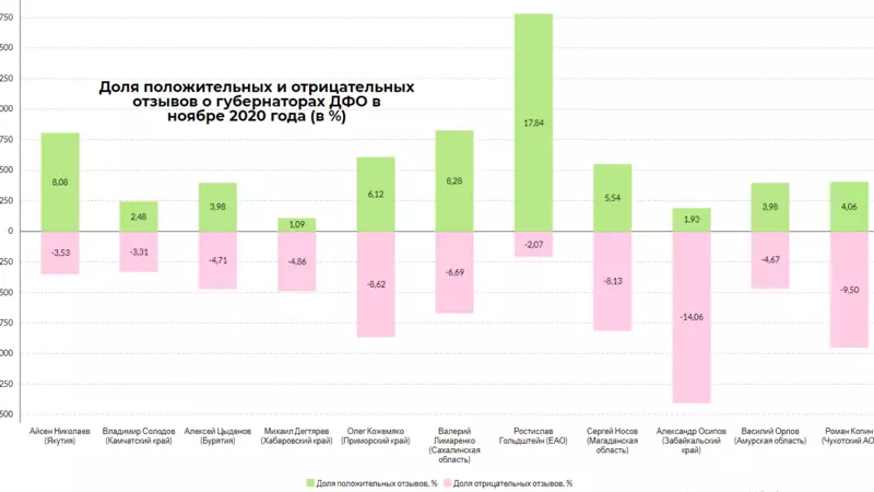 По доле однозначно позитивных сообщений губернатор Сахалинской области вошел в тройку лидеров и занял второе место на Дальнем Востоке с показателем 8,28 процента. Валерий Лимаренко уступил только коллеге из ЕАО Ростиславу Гольдштейну — положительный посыл был в 17,84 процента публикаций о нем. Замкнул тройку лидеров губернатор Республики Саха Айсен Николаев, о котором граждане отзывались хорошо в 8,08 процента случаев. Аутсайдером по этому показателю стал врио главы Хабаровского края Михаил Дегтярев — его хвалили всего в 1,09 процента постов.