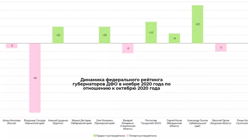 За месяц в федеральном рейтинге остались неизменными позиции губернаторов Хабаровского края и Чукотки. Валерий Лимаренко потерял шесть пунктов, глава Амурской области — пять, руководитель Республики Саха — три. Самые серьезные имиджевые потери понес глава Камчатского края Владимир Солодов, рейтинг которого рухнул на 42 пункта по итогам ноября. Самая большая прибавка по упоминаниям в социальных сетях отмечается у Александра Осипова: 23 пункта.