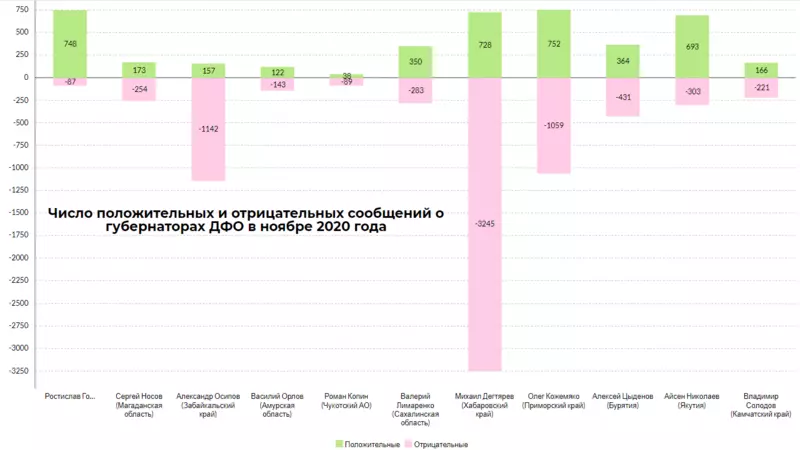 Что касается сообщений с критическим оттенком, Лимаренко и по этому показателю стал крепким «середняком», заняв шестую позицию на Дальнем Востоке. Главу Сахалинской области в ноябре ругали 283 раза. Самым ярким «магнитом негатива» стал Михаил Дегтярев, которого раскритиковали в 3 245 сообщениях. Также в топ-3 вошли губернатор Забайкальского края Александр Осипов (1 142 сообщения с замечаниями) и Олег Кожемяко (1 059).
