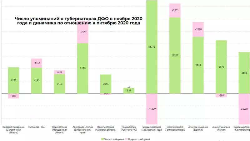 В федеральном рейтинге губернатор Сахалинской области занял 66-е место. Самое высокое место у врио главы Хабаровского края — вторая строчка уже не первый месяц подряд. Губернатор Приморского края стал 24-м, глава Бурятии — 38-м. Абсолютным аутсайдером остается Роман Копин — глава Чукотского АО занял 85-е место. К слову, он до сих пор сохраняет позицию наименее упоминаемого губернатора в социальных сетях — за ноябрь губернатору посвятили всего 937 сообщений, на семь больше, чем в ноябре.