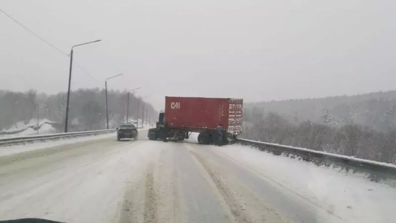 На корсаковской трассе 13 января контейнеровоз врезался в отбойник. Водитель большегруза не справился с управлением в метель, и транспорт занесло при подъеме в горку. Автолюбители просят земляков быть предельно осторожными — на дорогах наблюдаются переметы, гололед и снежная каша.