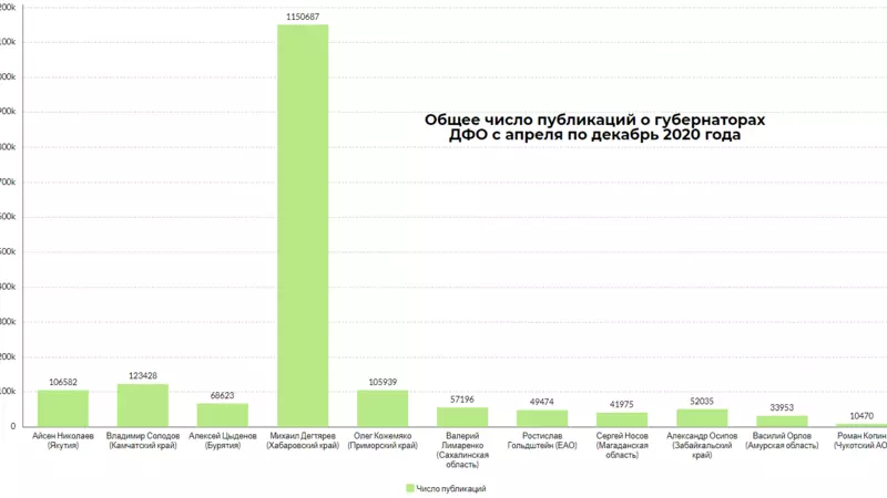 В тройку самых упоминаемых губернаторов по итогам 2020 года вошел один дальневосточный руководитель. Врио главы Хабаровского края Михаил Дегтярев занял второе место по этому показателю, уступив только мэру Москвы Сергею Собянину. О губернаторе, который возглавил регион летом 2020 года, за два квартала написали 1,15 миллиона сообщений. Еще 32 губернатора с апреля по декабрь набрали более 100 тысяч упоминаний — в их число вошли, в частности, первое должностное лицо Камчатского края Владимир Солодов (123 428 сообщений), глава Республики Саха (Якутии) Айсен Николаев, о котором пользователи соцсетей написали 106 582 публикации, и руководитель Приморского края Олег Кожемяко (105 939 постов).