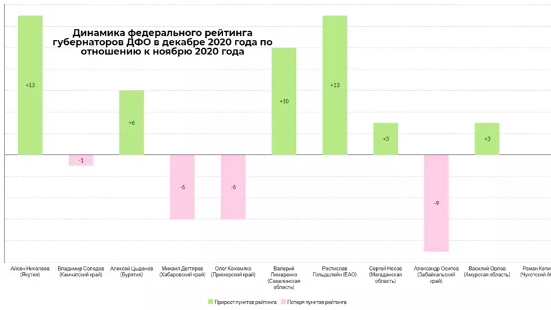 В федеральном рейтинге Валерий Лимаренко заработал дополнительные очки и поднялся сразу на 10 строчек в сравнении с ноябрьскими позициями. Это второй результат на Дальнем Востоке — глава островного региона уступил лишь Айсену Николаеву (Якутия) и Ростиславу Гольдштейну (ЕАО), которые «выросли» на 13 пунктов. Сейчас сахалинский губернатор по числу упоминаний в соцсетях занимает 56 место, став одним из шести дальневосточных руководителей регионов, о которых стали говорить чаще. Четверо политиков — главы Хабаровского края, Приморья, Камчатки, Забайкалья — по этому показателю провалились, опустившись в федеральном рейтинге. Падение составило от 1 до 9 пунктов. Единственным стабильным губернатором по этой оценке остался Роман Копин — глава Чукотки как был на 85 месте по России, так там и остается.